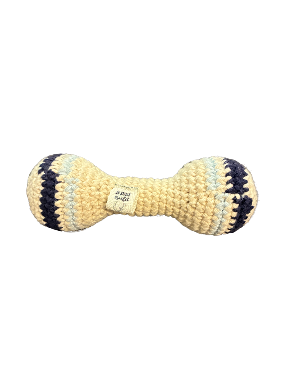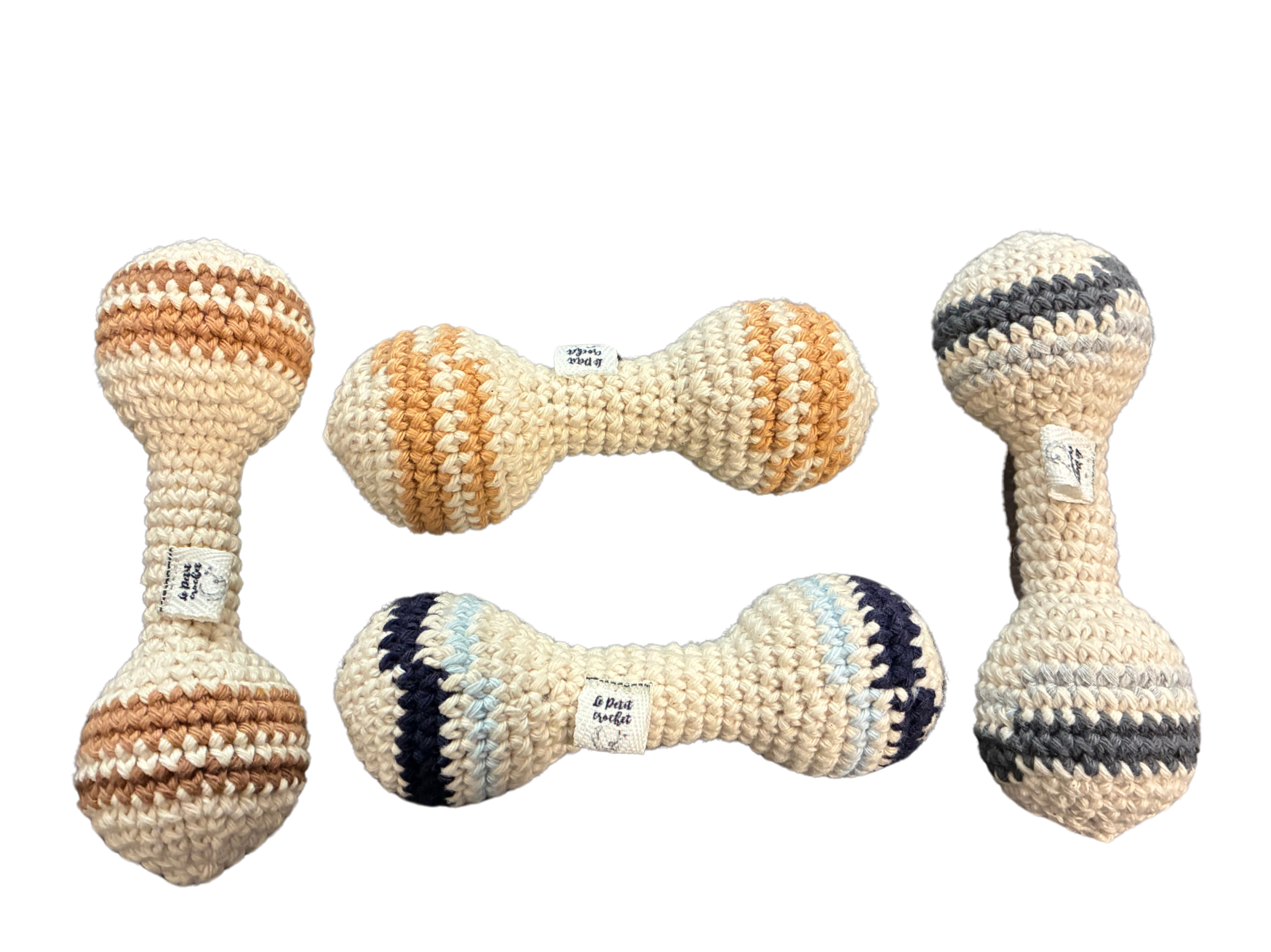Sonajero hecho de algodon, tejido en la tecnica de crochet, con 2 argollas en madera natural.